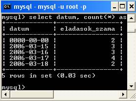 SELECT datum,COUNT(*) AS eladasok_szama FROM tabla GROUP BY datum;