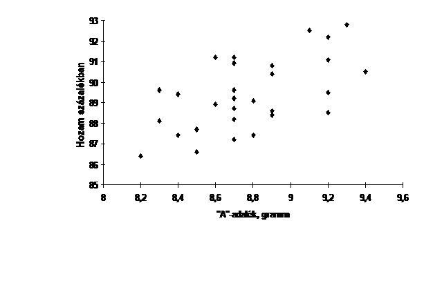 MEGJEGYZÉS - Ez a pontdiagramm kimutatja, hogy az "A"-adalék mennyisége és az általa eredményezett hozam között gyenge pozitív összefüggés áll fenn.